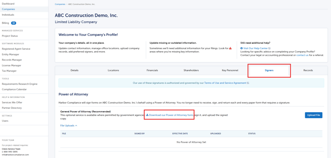 You may want to allow Harbor Compliance the ability to sign forms on your behalf when required. This articles guides you through the steps to download our pre-written Power of Attorney form.
